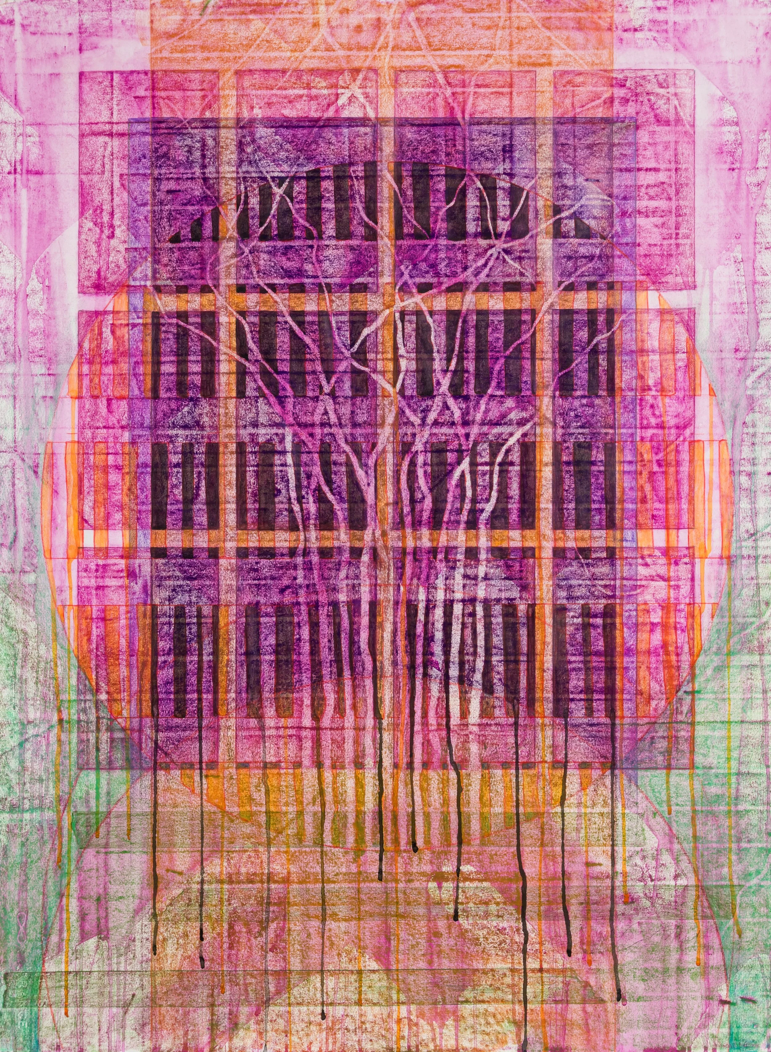 The Radicle View pieces are mixed media rubbings on paper, mounted on panel. “Radicle”is a term for the part of a plant embryo that develops into the primary root, or a rootlike subdivision of a nerve or vein. Radical View alludes to the root/branch and window pane motifs that characterize the series. Rubbings obviously explore surface texture, but they also show what’s beneath the surface. I am intrigued by the play between what is hidden and revealed, and how that play makes space for mystery.