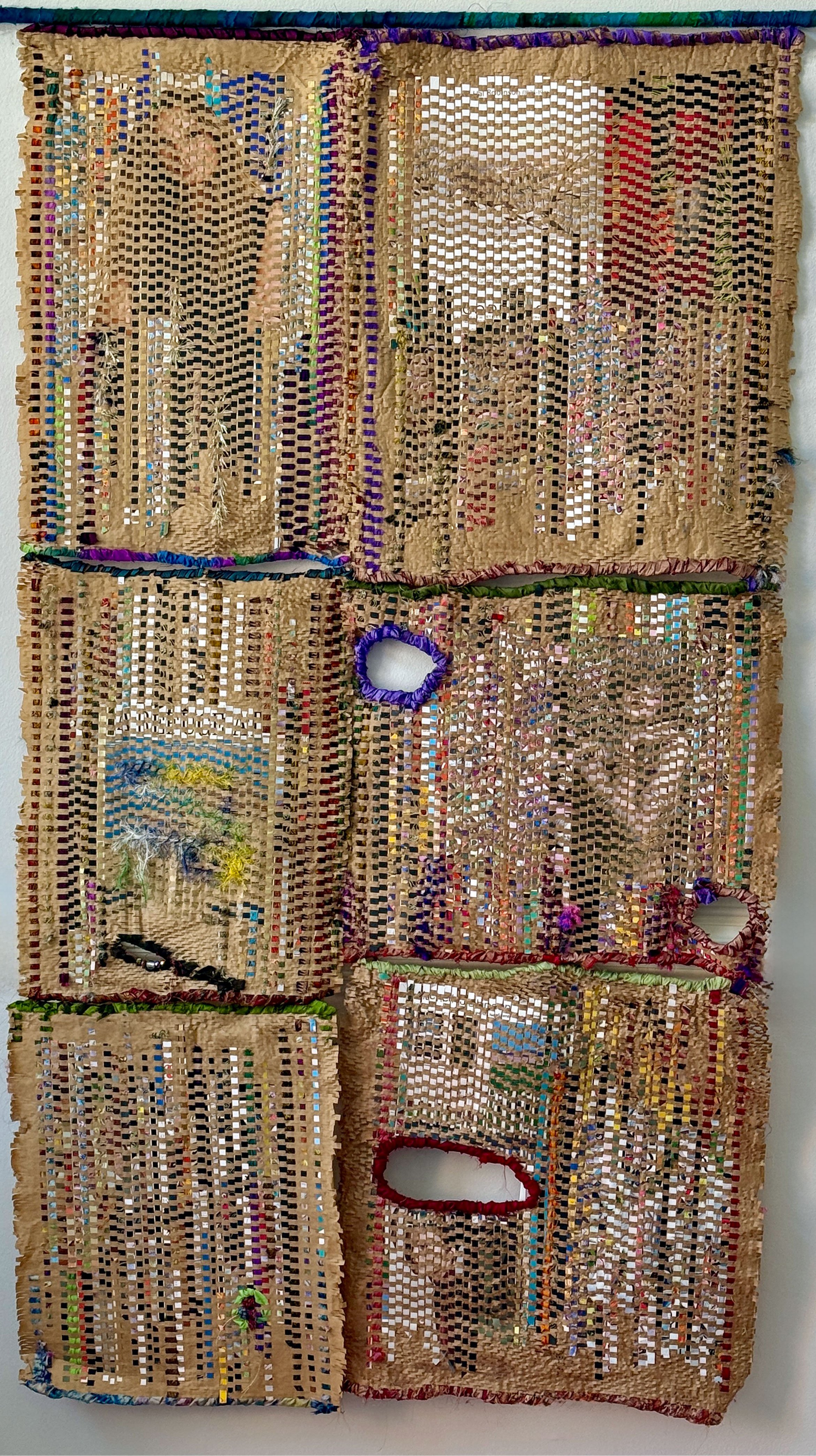 In my current work, I use paper weaving to convey stories within stories, hidden between and within layers of papers and threads. The woven panels are constructed using honeycomb packing material and paper strips cut from magazine covers. My weavings represent a visual language where each strip of paper expresses a memory or thought; and images, objects, and text are concealed within deeply layered or sparsely woven layers. The quiet, rhythmic process of hand weaving and the layers I create represent the experiences of many people who navigate between visibility and invisibility, hiding and revealing—always cognizant of thoughts and feelings diminished and marginalized by societal norms that demand conformity.