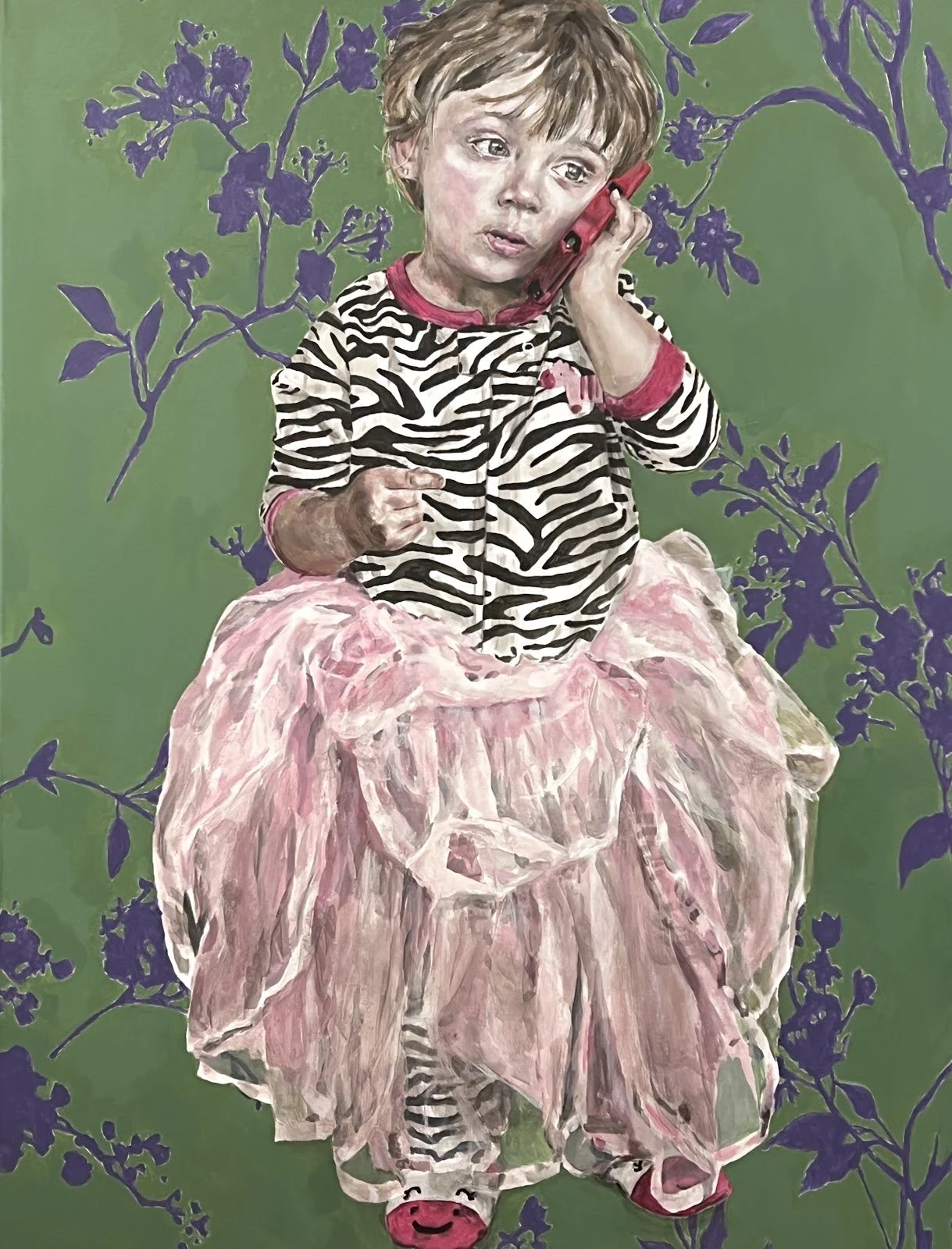 Art nouvou inspired graphic floral background, with a young girl in a oversized tutu, speaking on the phone.