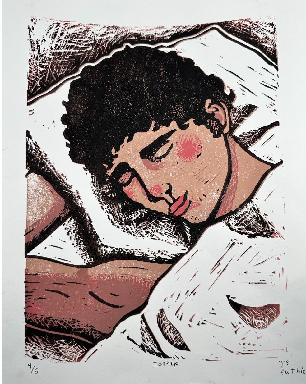 Joshua is a linocut print I made in late 2023 for art class. While this was not my first linocut print I had made, it was my first one in color. The limit to the amount of color we could use was 5 including the white of the paper so I tried to push myself to use a more limited color palette of mostly browns which I typically don’t do. Because of the medium I also had to use harder edges for the forms in the print where I usually soften edges. I chose the subject of someone sleeping because it allowed me to have so much negative space with the sheets and pillow.