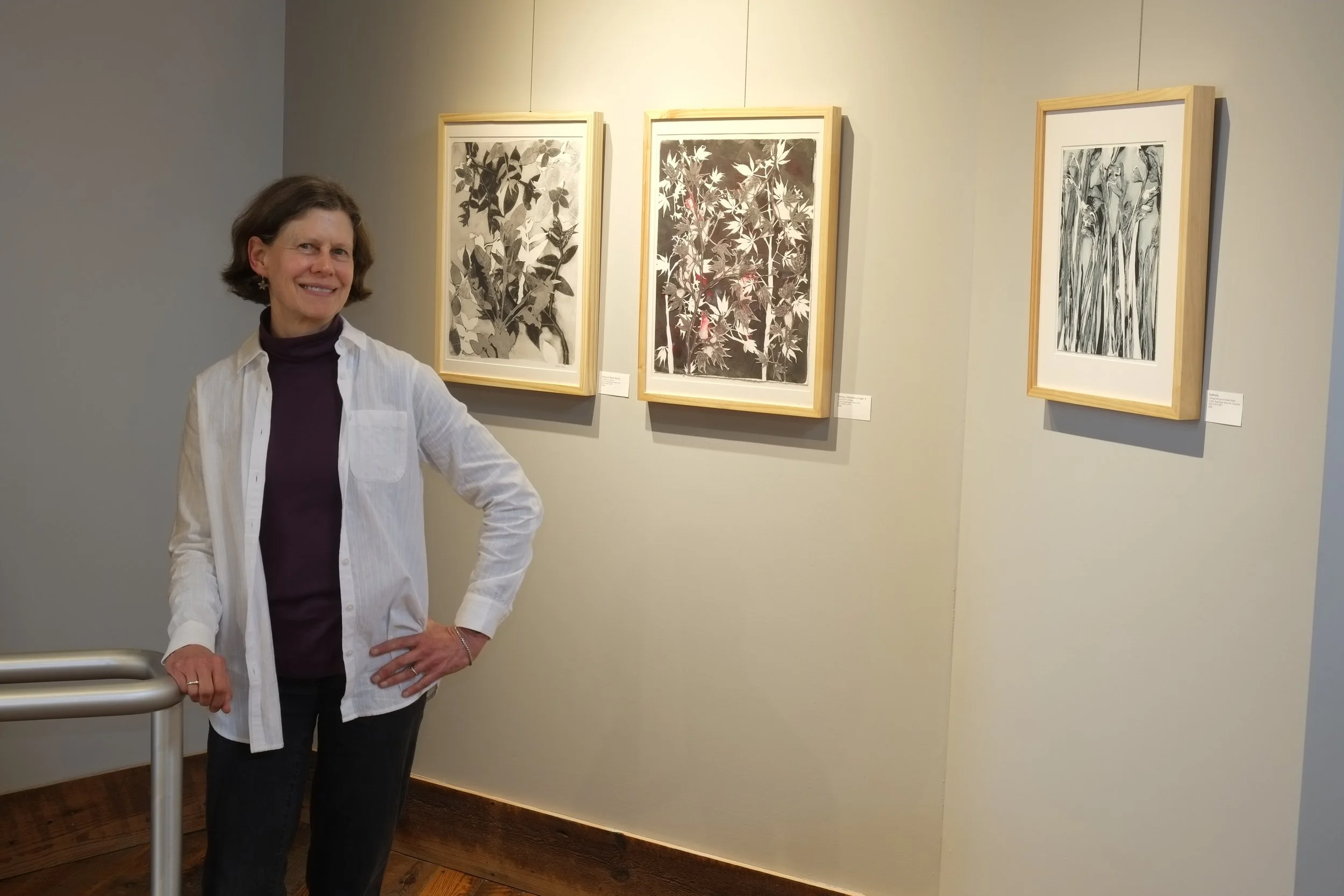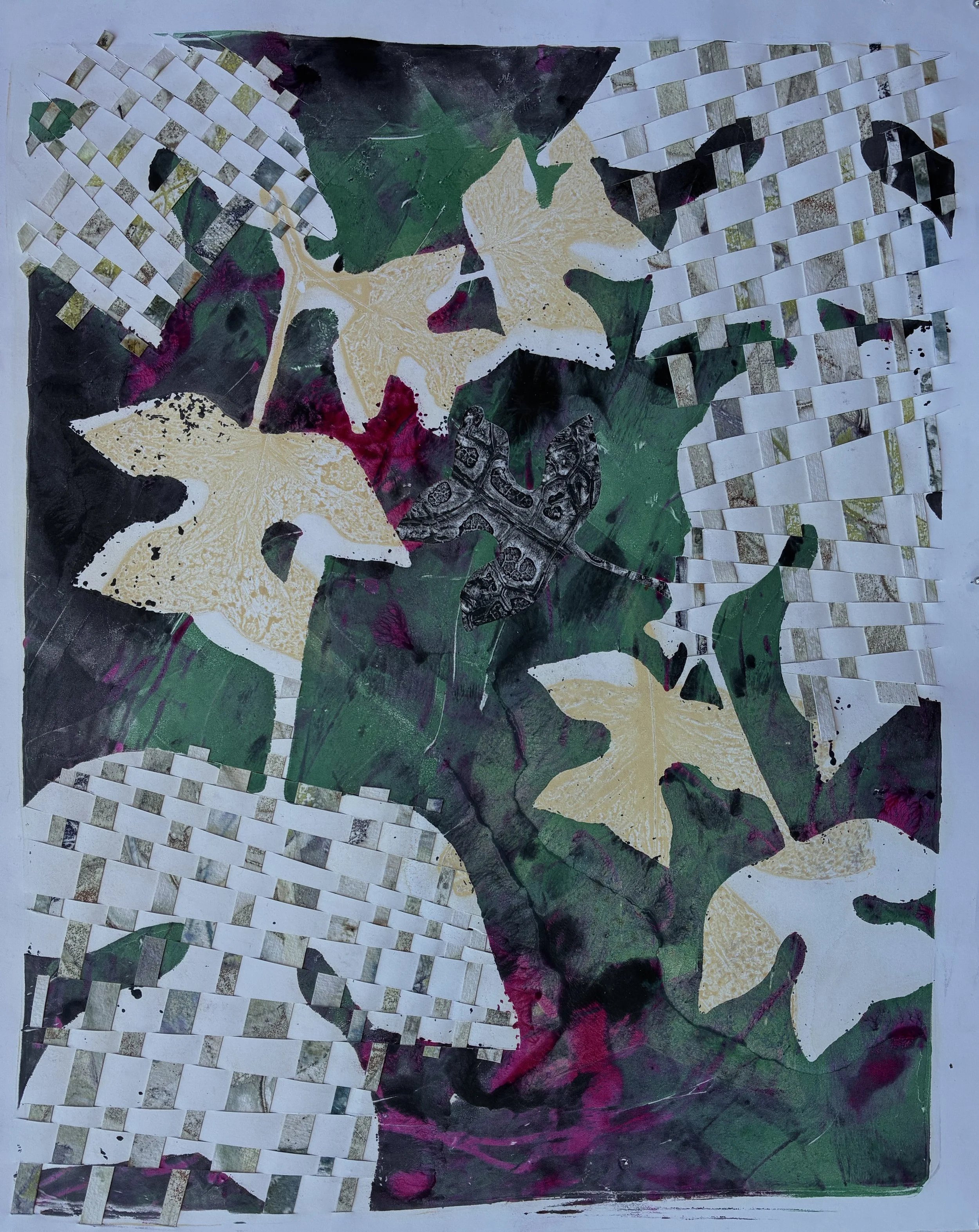 Emily Clare creates works on paper that respond to the fragility of our environment and the crucial relationships we have with botanical life. Starting by collecting native, invasive and exotic plants found during explorations in the landscape. She prints parts of plants to capture their shape and textures using color to create a portrait of a region remarking on a changing and fragile environment by weaving prints together. Invasive plants seem to weave their way through our natural landscape having lasting effects on the ecosystem, and local wildlife.