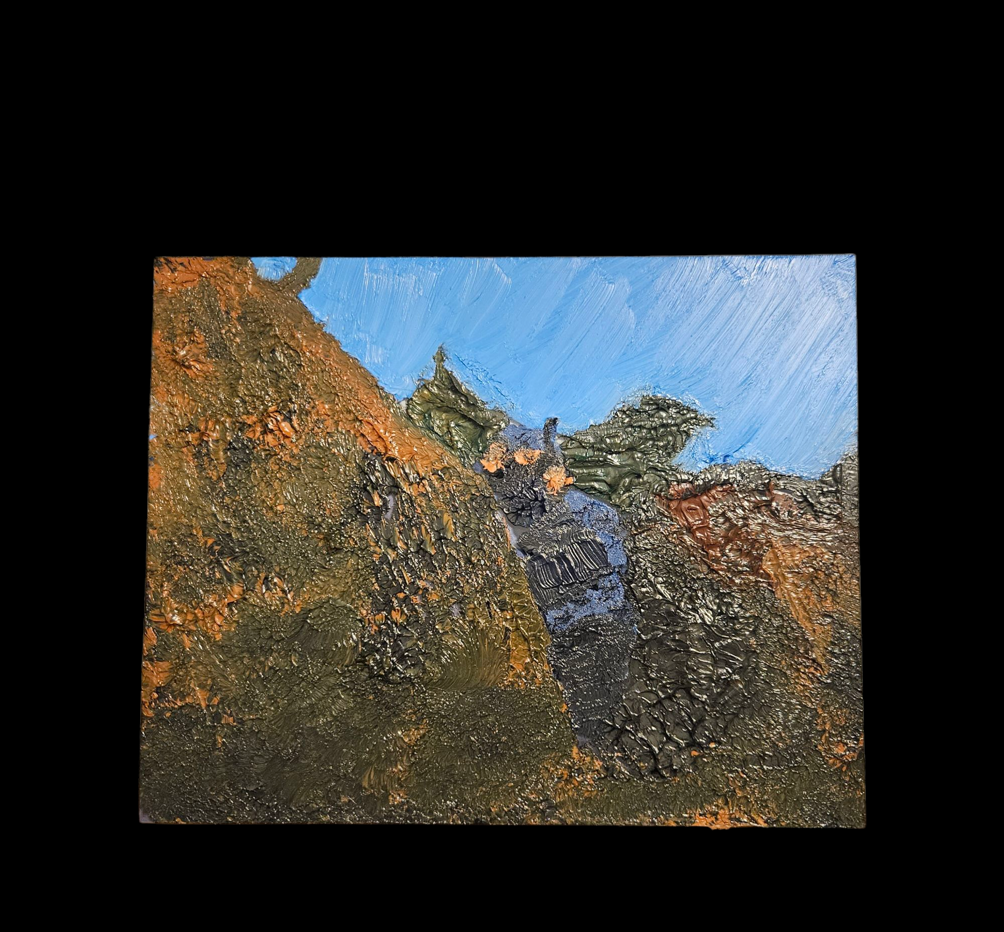This work is a visual manifestation of my internal architecture — a mixed media “sculpture” forged from the tension between protection and paralysis. My gaze is trained outward, an act of hypervigilance that shields me from reflection but imprisons me in the distance it creates. Each layer of armor — anger, sarcasm, deflection — has been tempered by broken promises and misplaced trust, forming a shell both protective and suffocating.