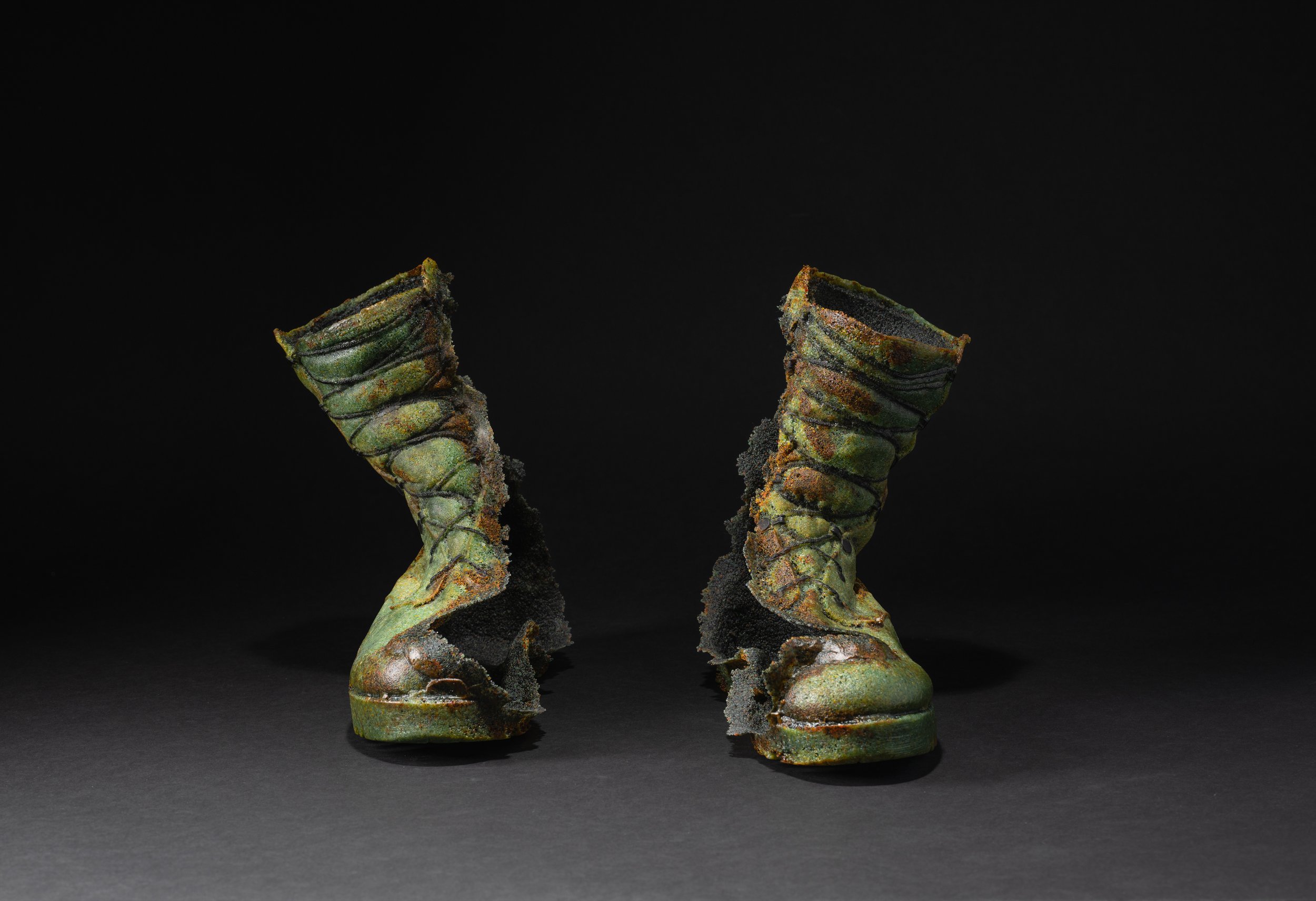 Pâte de Verre, which translates to "paste of glass," is a kiln-fired glass technique celebrated for its capacity to render fine detail. By using this method to construct hollow forms, I am able to create vessel-like skins that embody the complexities of a soldier’s experience. The forms, shaped through meticulous mold-making, seem to emerge from a struggle—rooted in a fading history yet preserved in the visual language of military iconography. Their grainy, gritty surfaces evoke the enduring texture of time and memory.