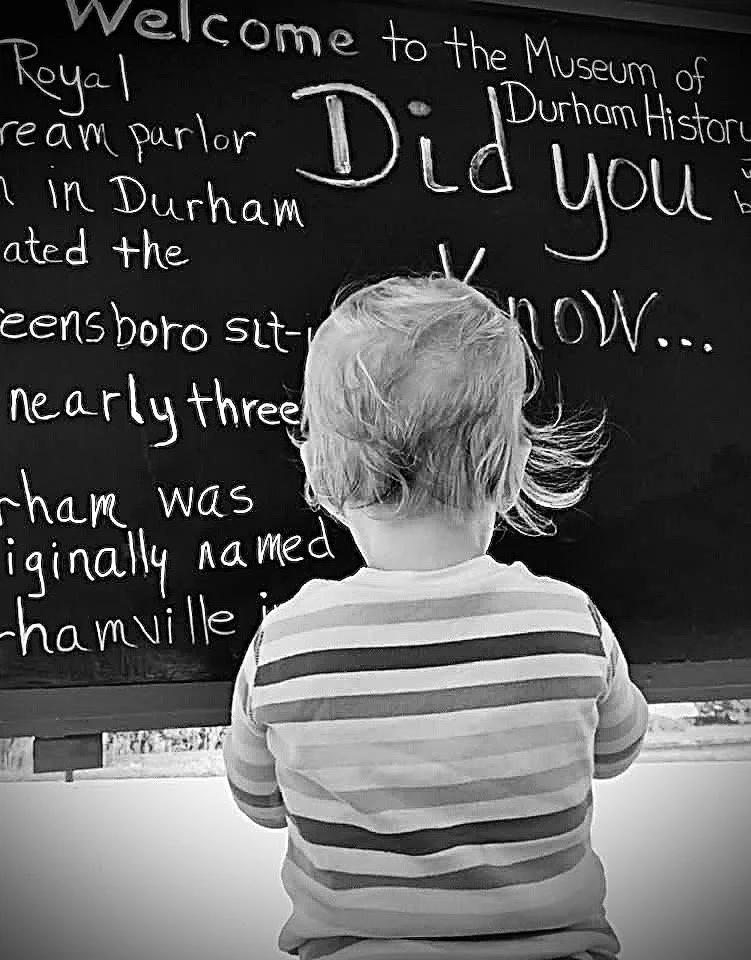 My photography reflects a commitment to preserving that history. This piece of my work entitled “I Am Durham History” features a toddler standing before a chalkboard full of Durham History facts at the Museum of Durham History. Empowering our youth is the key to building a brighter future! Teaching them early, teaching them young is essential for creating a strong foundation. That foundation includes knowing the unique history of our beautiful city. That's where the Museum of Durham History comes in as a catalyst to inspire you and our youth to explore the fascinating facts, success stories and interesting statistics of our rich history. By sharing Durham's history with our youth, we help them develop pride and care for the very history they are standing upon each and every day. By reaching youth on Durham's history that the young mind would find interesting, we can build a pride in Durham that helps them build a desire to protect, help grow and be a part of our city in positive ways. Thus, reducing youth crime. From the brave story of the Royal Ice Cream sit-in to the introduction of Durham Bulls baseball. The account of the city's first library to our first recording of a rap song. The organization of the NC Mutual Life Insurance Company had all eyes of Durham. All of these stories and more can be found at the Museum of Durham History where they welcome and engage our youth through personal visits, school tours and even participation in some historical displays. -