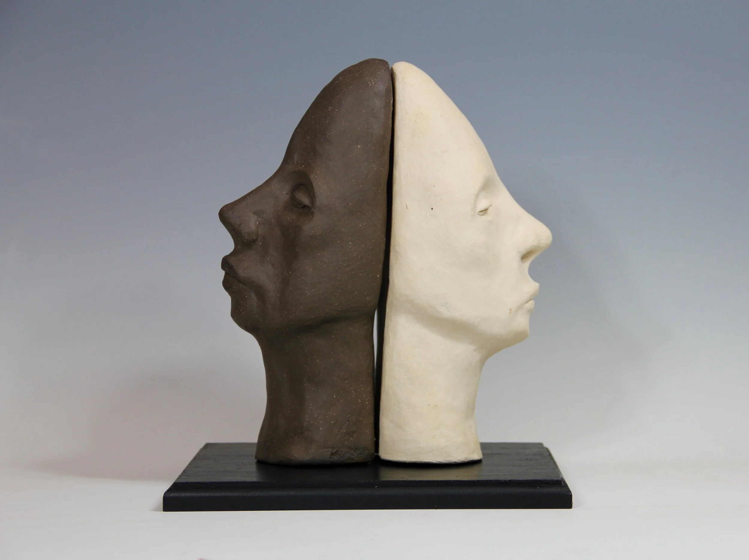 My work in racial justice has influenced my sculptural work. Our History is a comment on the fact that white and African American people in this country share centuries of history but their experience and understanding of that history have often been in opposition, hence the heads facing in opposite directions. The sculpture titled January 6 highlights the white male anger and hostility that defined that political moment and undergirds white supremacy in our country today. -